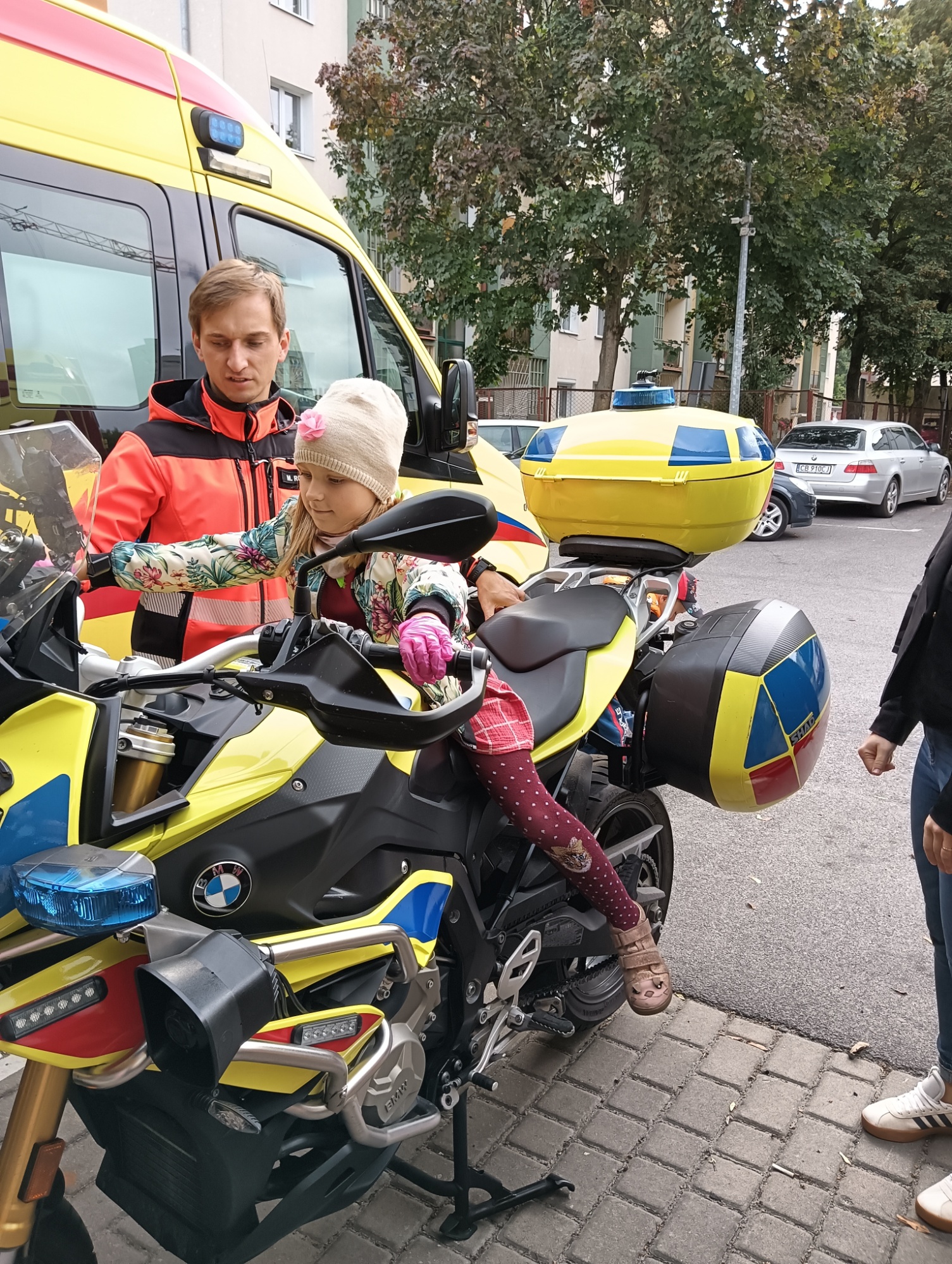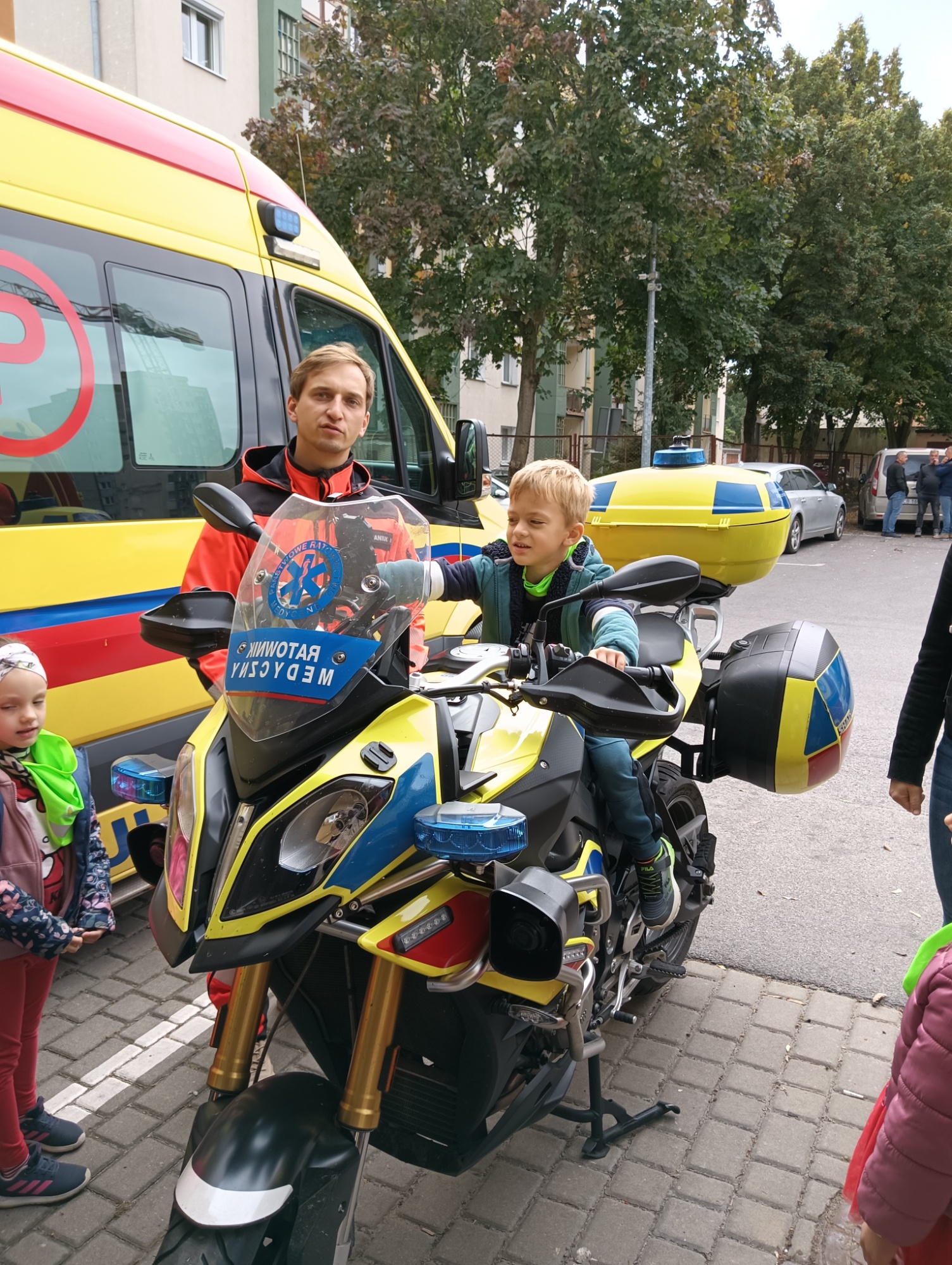 13 września w kalendarzu świąt nietypowych obchodziliśmy dzień pierwszej pomocy. Z tej okazji dzieci przygotowały laurkę dla ratowników medycznych w Bydgoszczy. Chcąc poznać bliżej na czym polega praca ratownika, w poniedziałek 5 i 6-latki odwiedziły Wojewódzką Stację Pogotowia Ratunkowego. Tam, pod nadzorem ratownika medycznego p. Macieja R., utrwaliły wiedzę, w jaki sposób wezwać pomoc do osoby poszkodowanej. Pan Maciej omówił z dziećmi, kiedy należy wezwać karetkę oraz jak się przygotować na przyjazd pogotowia ratunkowego. Dzieci poznały czym jest defibrylator, jak jest oznaczony budynek, w którym się znajduje oraz jak z niego korzystać. Przedszkolaki nauczyły się jak przeprowadzać resuscytację. Ponadto zwiedziły zakątki pogotowia ratunkowego. Odwiedziły samego pana dyrektora w jego gabinecie, widziały jak pracują panie w finansach. Były w garażu karetek, dyżurce ratowników, widziały magazyn leków. Największą atrakcją było zwiedzanie karetki oraz motocyklu medycznego. Sygnały świetlne i dźwiękowe wywołały niezapomniane wrażenie! Dziękujemy za serdeczną gościnność.