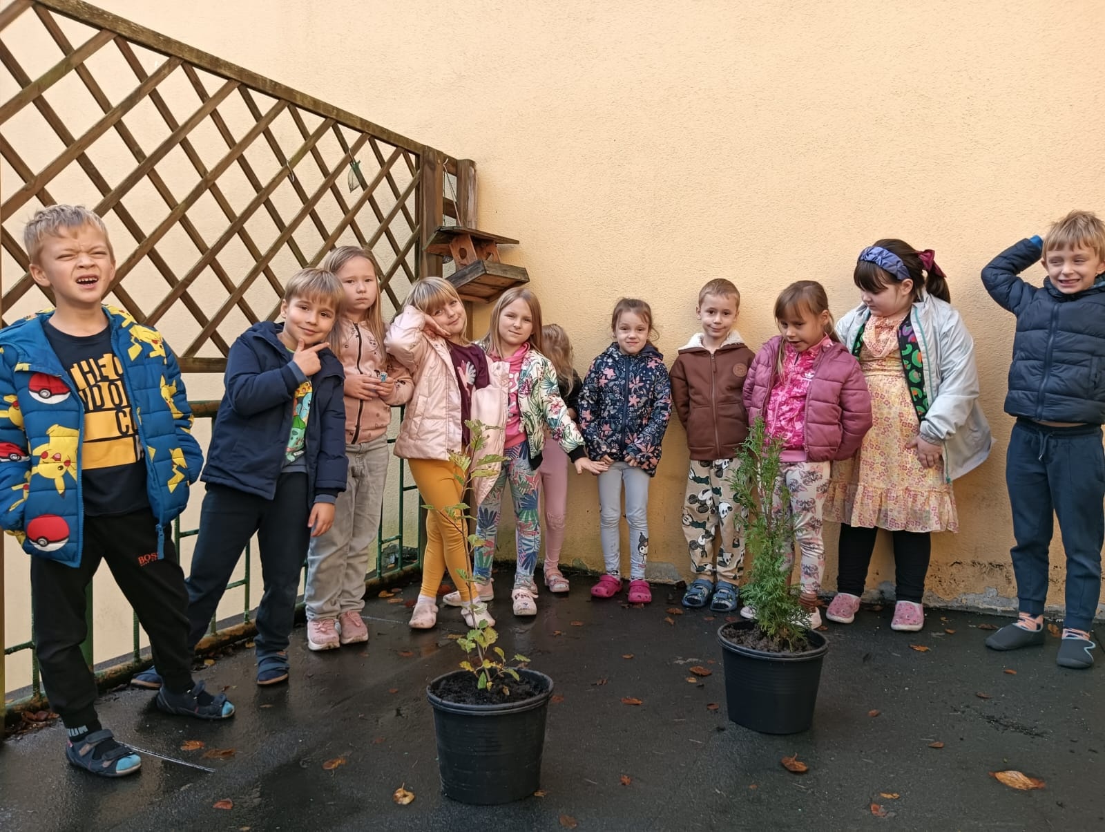 Nasze przedszkolaki doskonale znają wartość drzew. W tym roku dzieci zaszadziły sadzonki jarząbu oraz żywotnika. Podczas tej czynności miały okazję zobaczyć jak wyglądają korzenie małych sadzonek. Gaik na tarasie zaczyna się rozrastać.